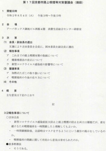 京都市路上喫煙等対策審議会の摘録は市のウェブサイトで公開されているが、発言者名は入っていない。京都市に情報公開請求して入手した発言者名入りのものを示す。京都市路上喫煙等対策審議会について: https://www.city.kyoto.lg.jp/bunshi/page/0000027624…